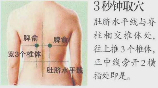 4、穴位:脾俞:脾为气血生化之源,经常按揉或艾灸脾俞穴,脾气健旺,可增强脾脏的运化功能,促进消化、吸收。