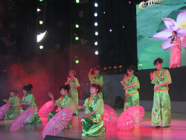 晚会在洋溢着青春、活泼的开场舞《跟我出发》中拉开了序幕。“弹一首小荷淡淡的香,美丽的琴音就落在我身旁”这一支由开福区选送的歌舞《荷塘月色》歌声甜美、舞姿优雅,一开始就把大家都带到了那美丽的荷塘之乡,让人沉醉;醴陵片区同仁带来的舞蹈《阿拉伯之夜》则是那么的激情四射、充满异域风情,让人眼前一亮;看完舞蹈《长大后我就成了你》、《土家摆手舞》、《爱你》便知道了美丽双舟花的魅力所在;如果说这些舞蹈有着优雅的意境,那么杰克逊的《dangerous》再现江湖便不只是传说,一出场便引来全场观众的阵阵尖叫与喝彩。