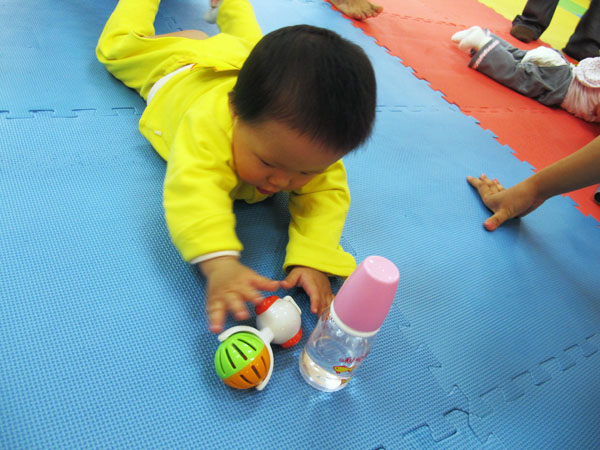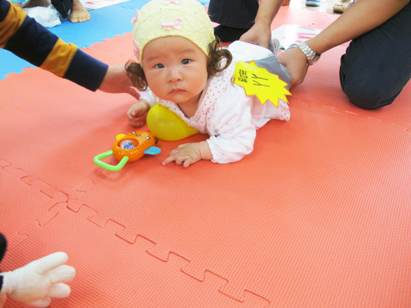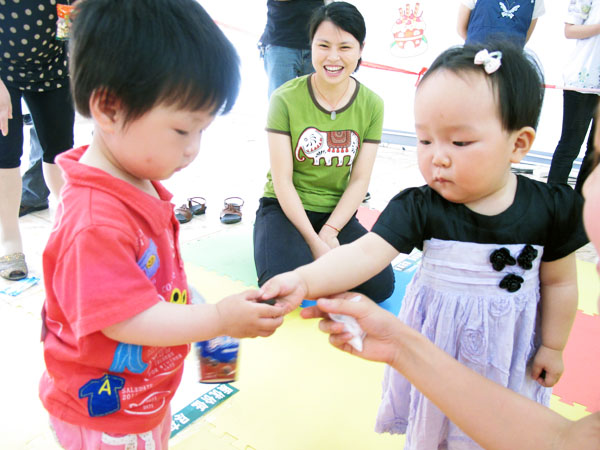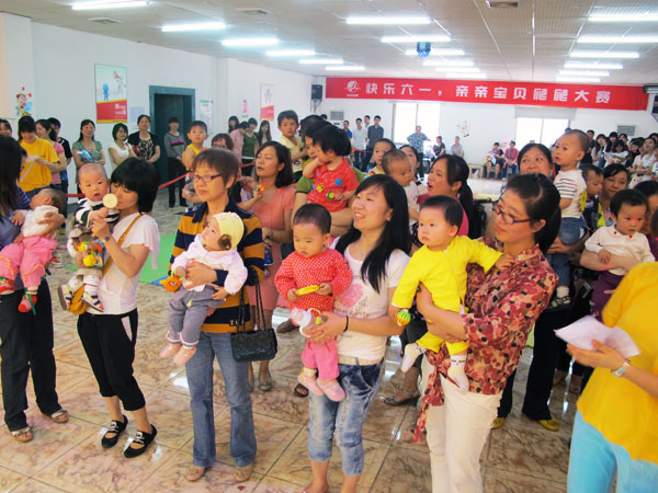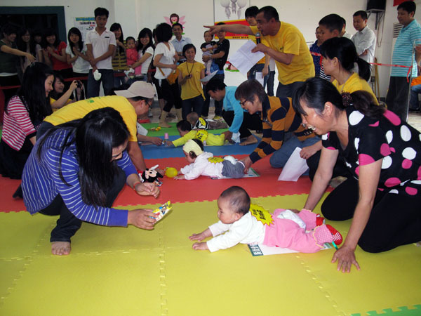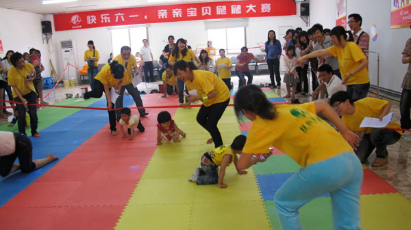 活力四射的上午,二十余名0至3岁的宝宝集体参加了“快乐宝贝向前爬”的活动。活泼可爱的宝宝们在辣妈帅爸和美丽志愿者姐姐们用糖果,玩具等方式的“连哄带骗”下,一路哭着、笑着、爬着、跳着,通过了“宝宝钻钻钻”、“小小搬运工”、“快乐背背背”等障碍,漂亮完成任务。