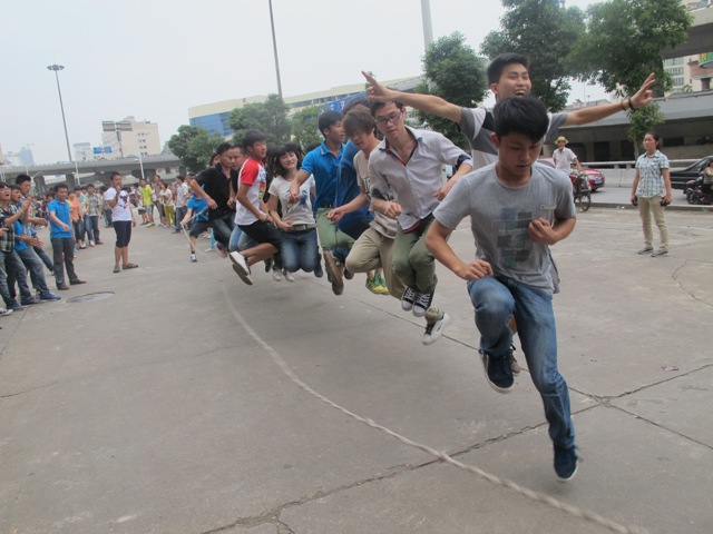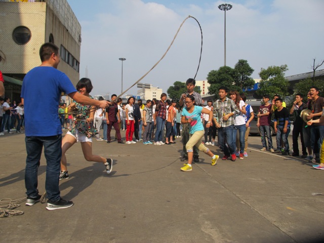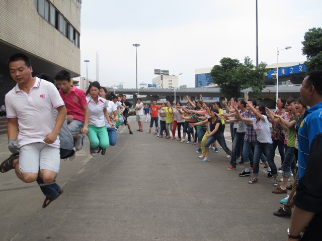 这次进行的是集体赛第一场,分为“逐个跳跳跳”和“齐心协力跳”两个项目,三大连队全心投入,每个连队分为三个小队,每队20个人参加两个项目的竞赛。