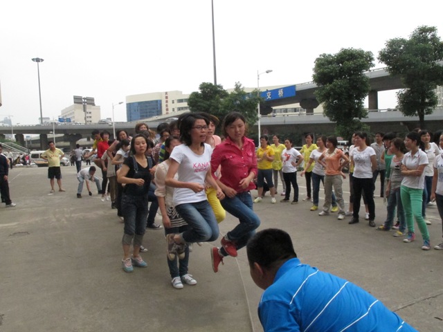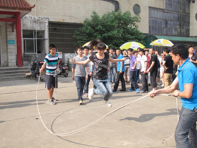 双舟宝贝们的激情一如夏日的阳光,燃烧着整个赛场:兄弟连吼声震天,儿童连锣鼓齐鸣,夜老虎侦查连呐喊不停。“逐个跳跳跳”开始了,伙伴们过绳那叫千姿百态,有的如逛公园般不慌不忙,轻松一闪而过;有的小心翼翼如踩钢丝;有的猛冲到绳前如羚羊般高高跃起,然后——跳了空绳,助威的伙伴们笑而不语。接下来重头戏“齐心协力跳”来了,这不仅需要足够的体力与耐力,更需要团队的默契。每个连队都把猛男们放到了甩绳的位置,随着裁判一声令下,宝贝们应声齐跳,偶尔有人失误了,大伙也没有一声埋怨,立马调整好,继续冲刺,这股劲头和热情让围观的路人都赞叹不已。